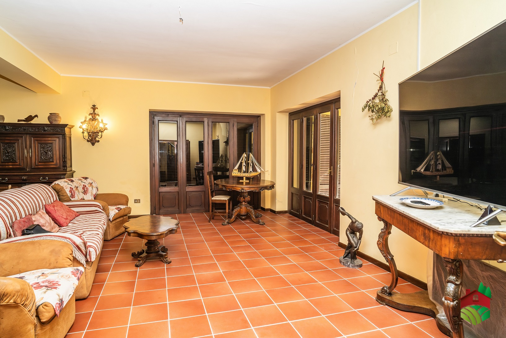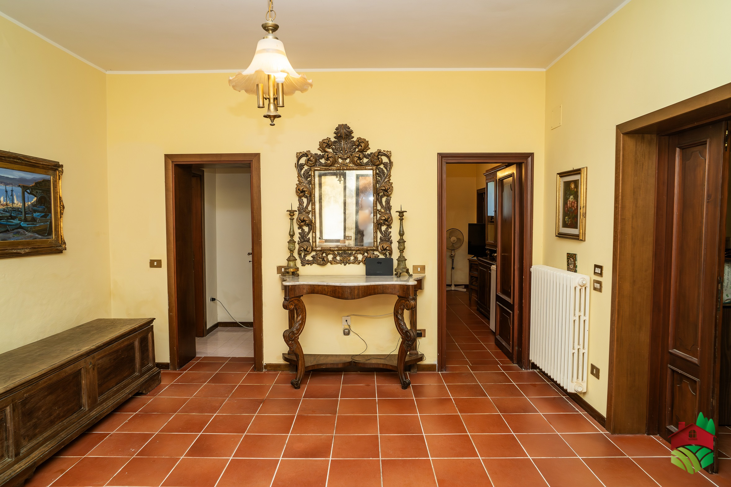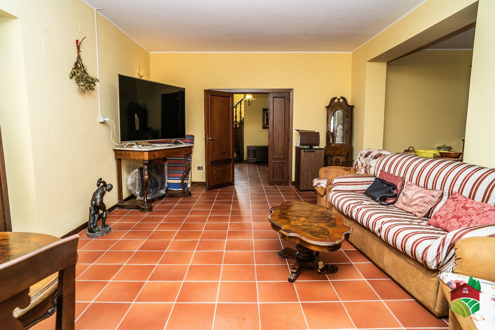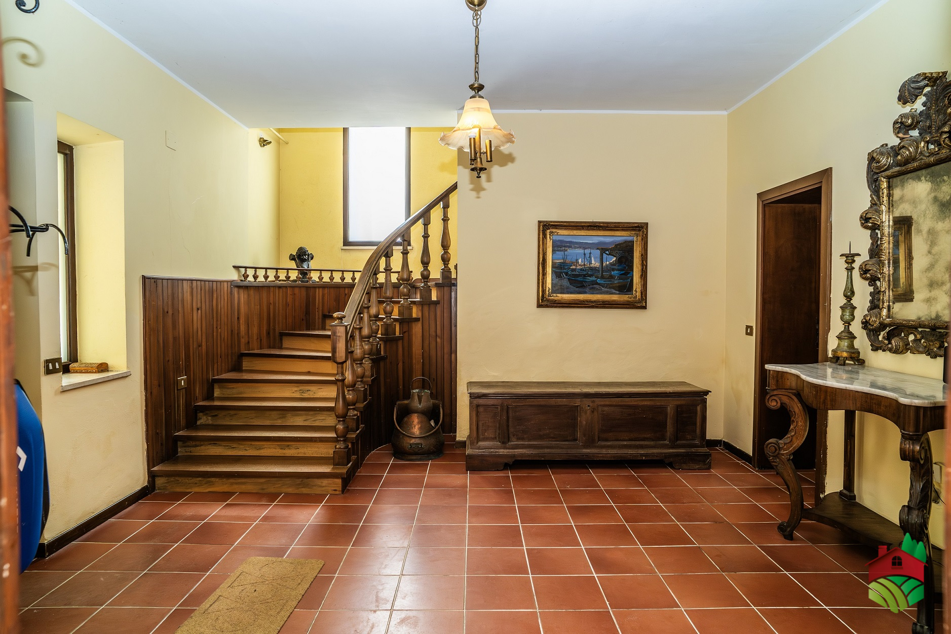 Al piano terra troviamo un ampio ingresso, dal quale si accede ad un salone triplo dove su una parete è ben visibile il camino rivestito in travertino e dal quale tramite delle porte finestre si esce su un ampio portico di circa 50mq.. Dal salone poi si passa alla zona tinello e da questa al vano cucina con camino dal quale tramite una finestrone si accede ad un ulteriore portico di circa 20mq.. Sempre a questo troviamo un bagno a servizio dell’intera zona giorno e all’altezza dell’ingresso principale vi è una scala curva rivestita in legno che conduce al piano superiore;