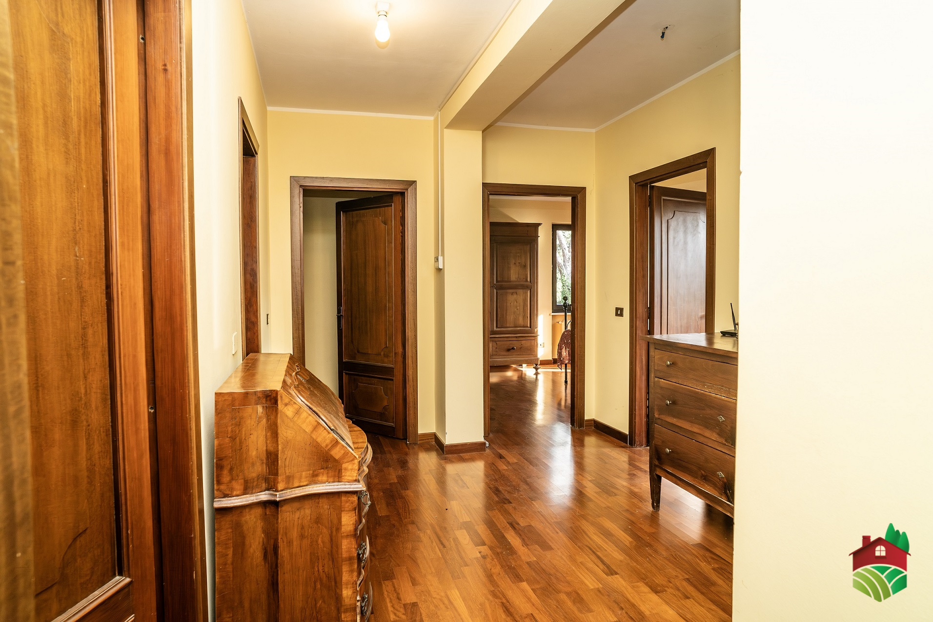Al primo piano troviamo subito un vano openspace adibito a disimpegno/studio con porta finestra che accede ad un largo terrazzo di circa 25mq., e dal corridoio disimpegno si diramano le 5 camere da letto di cui 2 con bagno interno finestrato, ed un ulteriore bagno padronale con vasca e doccia anche esso finestrato.